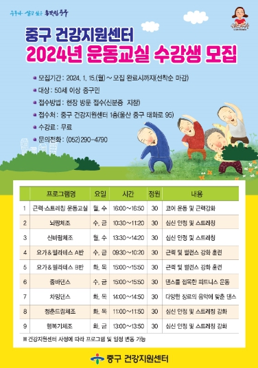 ![]() ‘운동으로 활력 충전!’…중구건강지원센터, 운동교실 수강생 모집 |