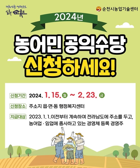 ![]() 순천시, 『2024년 농어민 공익수당』 신청 접수 |
