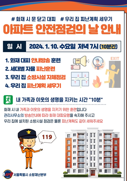 훈련에 앞서 입주민들이 동요하지 않도록 관리사무소에서 사전에 안내문과 안내방송을 통해 충분히 사전 안내를 한 후, 10일 저녁 7시부터 10분간 서울지역에 있는 아파트에서 동시에 실시한다.