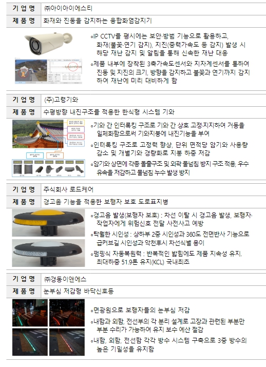 진명기 사회재난실장은 “정부는 국민의 안전과 함께 일자리 창출에도 기여할 수 있도록 공공성과 혁신성이 우수한 재난안전 혁신제품을 지속 발굴하고 지원해나가겠다”라고 밝혔다.