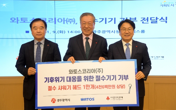 광주광역시는 9일 시청 비즈니스룸에서 와토스코리아㈜, 광주사회복지공동모금회와 함께 절수형 샤워기 헤드 기부 전달식을 가졌다.