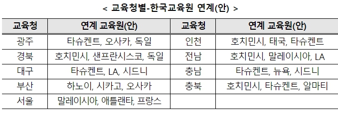2024년 한국어교육 기반 국제교육 활성화 사업 시범 운영 대상에 광주·경북·대구·부산·서울·인천·전남·충남·충북 총 9개 시도교육청이 선정됐다. 선정된 9개 시도교육청은 지방교육재정교부금 총 220억 원을 자체적으로 투입하여 각 시도교육청과 연계된 한국교육원과 함께 지역의 수요·여건에 맞는 국제교류협력 사업을 추진하고, 한국교육원에 한국어 보급과 유학생 유치 업무를 지원하는 한국어전문관과 일반직공무원을 파견한다.