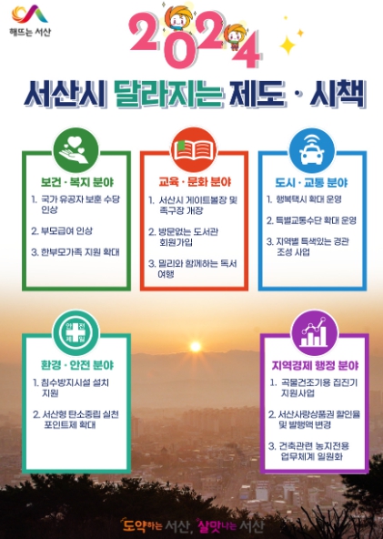도시·교통 분야에서는 ▲행복택시 확대 운영 ▲특별교통수단 확대 운영 ▲지역별 특색있는 경관조성 사업 ▲해미 안올수가 읍성! 해미 잊을수가 읍성! 경관 개선 등이 시행된다.