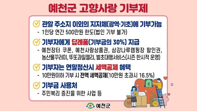 예천군은 답례품으로 예천사랑상품권, 예천장터쿠폰, 삼강나루캠핑장 할인권, 농축산물 꾸러미, 과일젤리, 벌초대행서비스 등 다양한 품목을 제공하며, 특히 예천장터쿠폰은 온라인 쇼핑몰 예천장터에서 140여 가지 품목을 현금 추가결제를 통해 구매할 수 있어 전국 답례품 순위권에 이름을 올리기도 했다.