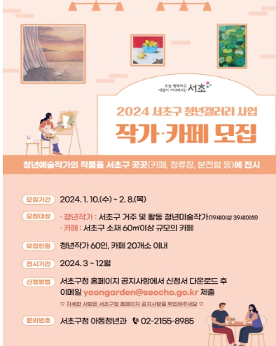 사업참여를 원하는 청년작가 및 카페 점주는 서초구청 누리집 내 공지사항에서 신청서를 다운로드 받아 이메일로 제출하면 되고, 다음 달 중 전문가로 구성된 심사위원회를 통해 작가 포트폴리오를 중점적으로 심사 후 참여 작품을 선정한다.