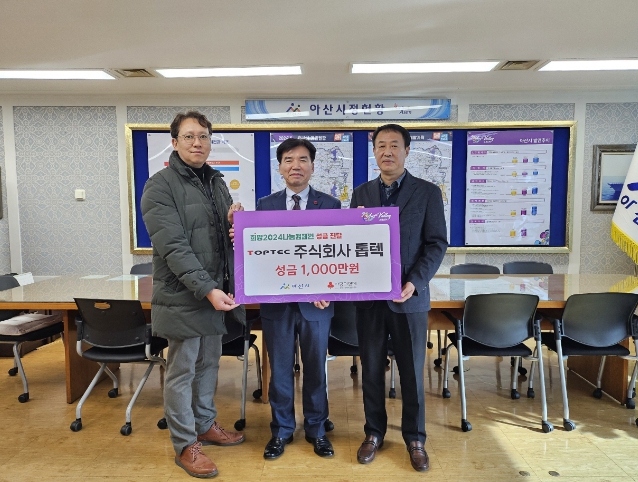 조일교 아산시 부시장은 “늘 지역사회를 위해 노력해 주시는 ㈜톱텍에 감사드리며, 맡겨주신 성금은 어려운 이웃들에게 잘 전달되도록 하겠다”고 감사의 마음을 전했다.