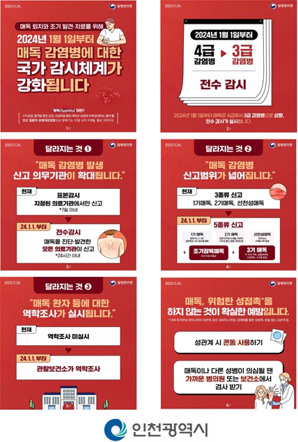신남식 인천시 보건복지국장은 “매독의 전수감시 체계 전환으로 지역 감염자 수를 제대로 파악해 실효성 있는 대책을 세울 수 있는 계기가 될 것을 기대하고 있다”면서 “감염병에 대한 철저한 감시체계와 신속한 대응으로 각종 감염병으로부터 우리 시민을 안전하게 지킬 수 있도록 최선을 다하겠다”고 말했다.
