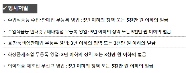 무허가‧무등록 관련 주요 위반은 ▲수입식품등 수입‧판매업 무등록 영업 42건(10.7%) ▲수입식품등 인터넷구매대행업 무등록 영업 31건(7.9%) ▲화장품책임판매업 무등록 영업 29건(7.4%) ▲의약외품제조업 무신고 영업 7건(1.8%) ▲화장품제조업 무등록 영업 6건(1.5%) 등이었다.