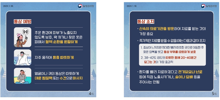 질병관리청 지영미 청장은 “한랭질환은 사전에 적절한 조치로 예방할 수 있으므로, 한파 시 야외활동 건강수칙을 준수해 줄 것”을 당부하며, 특히 “한파가 계속되는 겨울철에는 등산이나 스키타기 등 야외활동을 할 경우 날씨정보를 확인하고 준비운동을 충분히 한 후 보온에 신경을 써야 한다”고 거듭 강조했다.