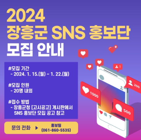 올해 장흥군이 모집하는 ‘SNS 홍보단’은 총 20명 내외로, 모집 기간은 1월 22일까지다.