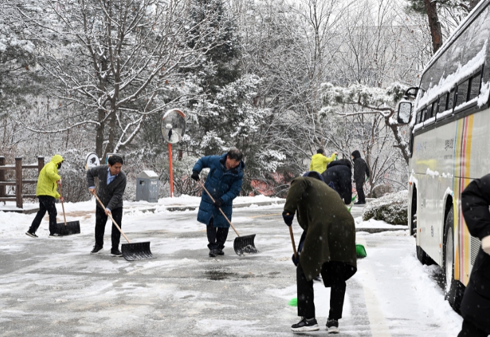 사무국 직원들은 인도 주변에 제설제를 배포하고 눈을 치우는 등 구슬땀을 흘렸다.