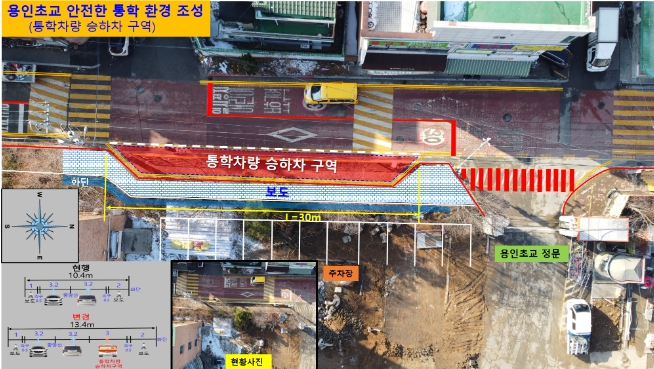 처인구는 학생들이 안전하게 하차할 수 있는 공간을 만들기 위해 용인초등학교 정문 앞에 30m 길이의 승하차 구역 설치를 결정했다. 통학 차량 정차 공간을 확보하기 위해 구는 용인교육지원청, 용인초와 협의해 기존 보도 통행로를 학교 부지 내로 이전 설치하기로 했다.