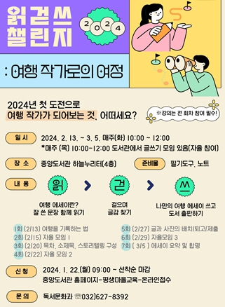 ![]() 인천광역시교육청중앙도서관, 읽걷쓰 챌린지 '여행 작가로의 여정' 참여자 모집 |