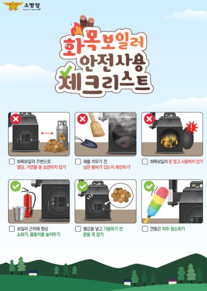 화목보일러 화재 안전수칙으로는 ▲화목보일러 주변으로 땔감, 가연물 등 보관하지 않기 ▲재를 치우기 전 남은 불씨가 있는지 확인하기 ▲문 열고 사용하지 않기 ▲화목보일러 주변에 소화기, 물동이 놓아두기 ▲연통 자주 청소하기 등이다.