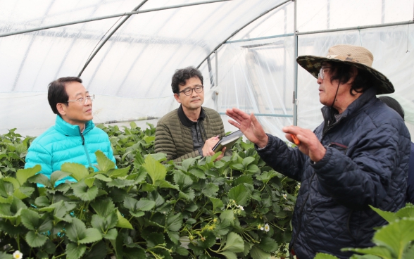 18일 강진군에 따르면 지난 17일 강진군 강진읍 송전리 장전마을과 서산리 옥치마을 일부 딸기 농가에서 딸기 도난 피해가 발생했다는 소식에 강진원 군수가 직접, 현장을 찾아 피해 상황을 파악했다.