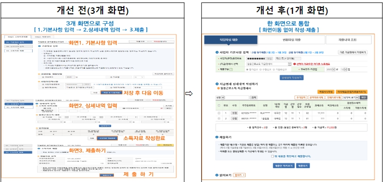 2) 여러 종류의 소득자료를 제출할 경우, 화면이동 없이 하나의 화면에서 제출하도록 통합