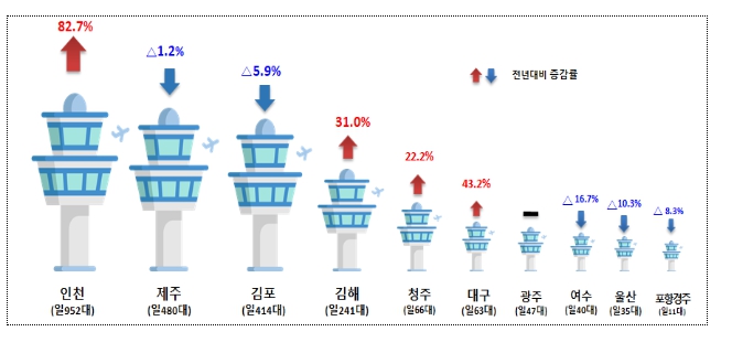 또한, 코로나-19 종식에 따른 펜트업 효과*로 인천공항(82.7%↑)뿐만 아니라 청주·김해·대구 등 지방 국제공항의 항공교통량이 각각 31%, 22%, 43%로 고르게 크게 증가했다.