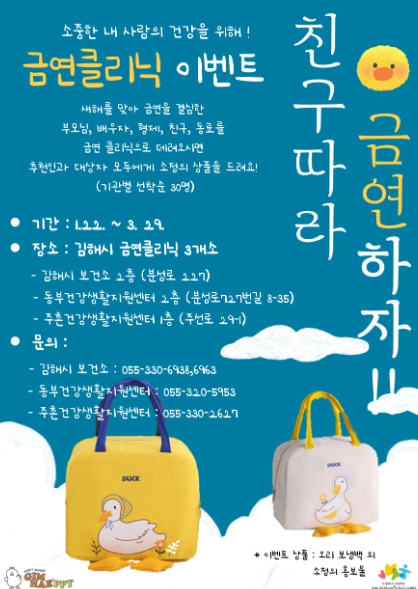 이번 행사는 김해시보건소와 동부건강생활지원센터, 주촌건강생활지원센터 금연 클리닉 3개소에서 동시 진행되며 금연을 결심한 흡연자에게 금연클리닉을 소개, 함께 방문하여 등록 및 금연 상담을 진행할 경우 추천인과 금연 대상자 모두에게 소정의 기념품을 제공한다.