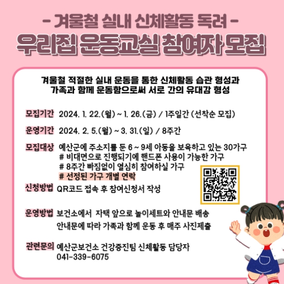 보건소 관계는 “이번 우리집 운동교실 운영을 통해 겨울철 적절한 실내 운동을 통한 신체활동 습관 형성하고 비만예방에 도움이 될 것으로 기대한다”며 “가족이 함께할 수 있는 놀이를 제공해 편안하고 안전한 분위기에서 아동이 자신의 감정과 생각을 표현하고 가족 간 소통과 유대감 형성을 통해 성취감, 상상력, 독창성, 협동심, 자립심 등 향상을 통해 성장의 발판이 되길 바란다”고 말했다.