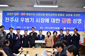 이어 그는 “완주군민이 동의하지 않는 밀어붙이기식 일방적인 통합추진은 반(反)민주적이며 더 나아가 지방자치의 근본 가치를 심하게 훼손하는 행위”라며 “지금이라도 우범기 전주시장은 완주군민 앞에 고개 숙여 사과하라”고 덧붙였다.