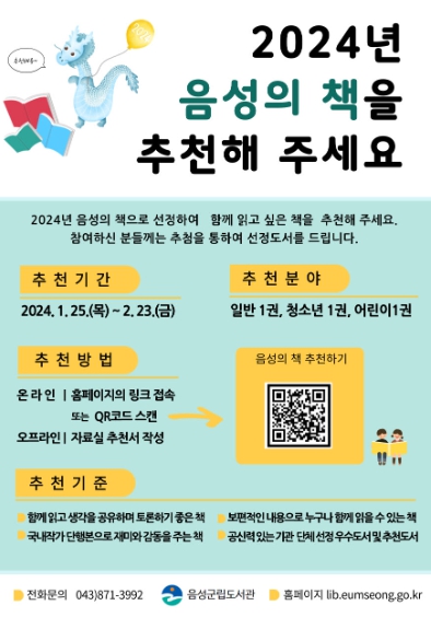 음성군민이면 누구나 자유롭게 추천할 수 있으며, 음성군립도서관 홈페이지와 홍보문 QR코드를 활용해 온라인으로 추천하거나, 4개의 음성군립도서관 자료실에 비치된 추천서를 작성해 각 도서관으로 제출하면 된다.