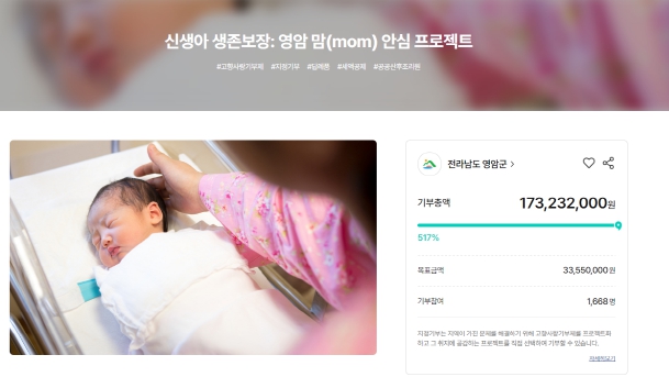 영암군에 설립될 공공산후조리원의 의료기기 구입비를 전국에서 후원받아 아이와 산모를 안전하게 지켜내겠다는 취지였다.