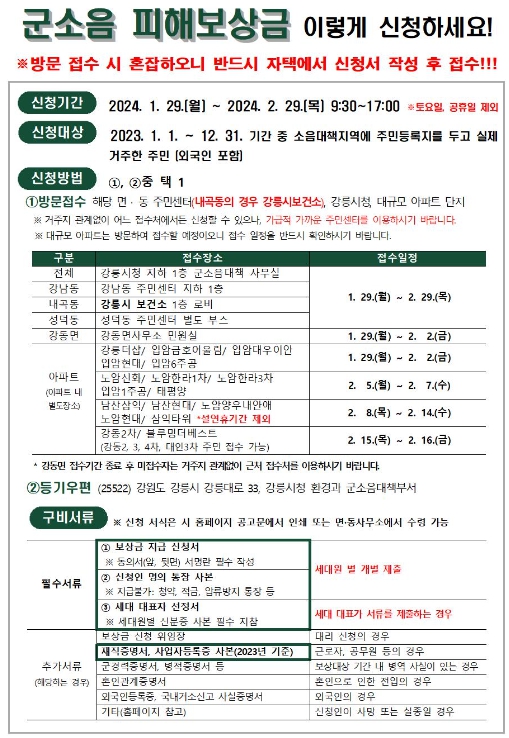 ![]() 강릉시, 군용비행장 소음피해보상금 신청하세요! |