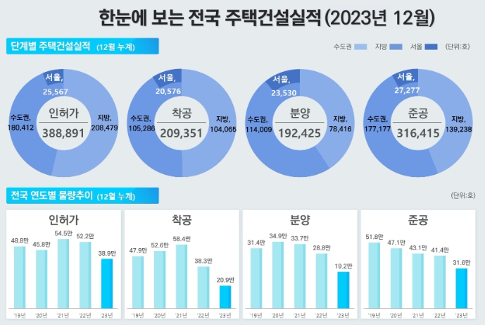 착공은 12월 38,973호로 전월(28,783호) 대비 35.4% 증가했고,12월 누계(1~12월) 기준 209,351호로 집계됐다.