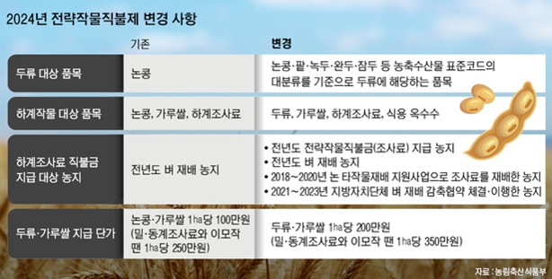 겨울에 동계 식량작물이나 조사료를 재배하면 ha당 50만 원, 여름에 식용 옥수수를 재배하면 ha당 100만 원, 두류·가루쌀은 ha당 200만 원, 조사료는 430만 원을 지급한다.