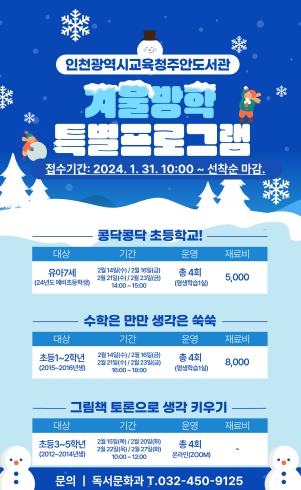 ![]() 인천광역시교육청주안도서관, 겨울방학 특별프로그램 학습자 모집 |