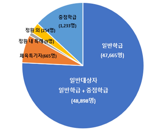2024학년도 서울 지역 교육감 선발 후기고에 입학 예정인 학생은 209개교에 총 49,826명(남학생 25,275명, 여학생 24,551명)으로 일반대상자 48,898명 (일반학급 47,665명, 중점학급 1,233명) ○ 체육특기자 665명 ○ 정원 내 특례 9명 ○ 정원 외 254명 (보훈자자녀, 지체장애인등, 특례입학 적격자)이다.