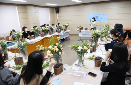 ![]() 임산부들이 생화 꽃바구니를 만들고 있다(지난해 임산부 교실 운영모습) |