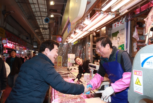 ![]() 박준희 관악구청장이 설 명절을 앞두고 신원시장을 찾아 상인들과 인사를 나누고 있다. |
