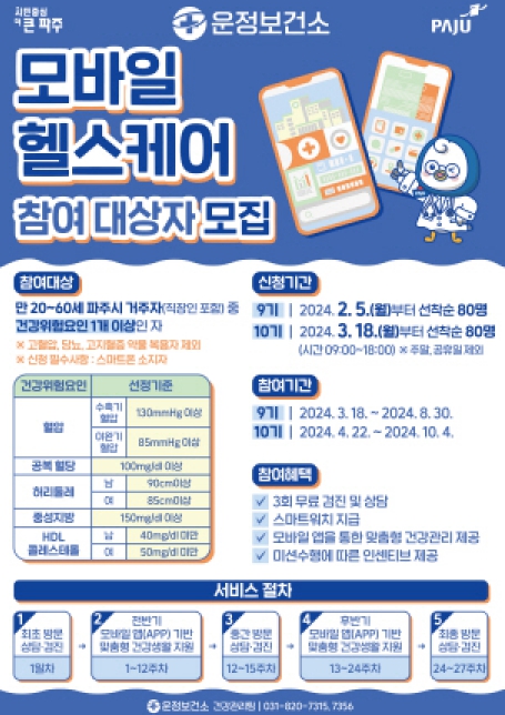![]() 내 손안의 건강지킴이…파주 운정보건소, ‘모바일 헬스케어’ 참여자 모집 |