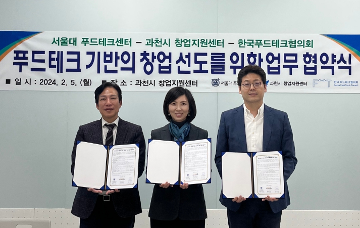 과천시 창업지원센터에서 열린 업무협약식에는 정유정 과천시 창업지원센터장, 권오상 교수(서울대 푸드테크센터), 이기원 한국푸드테크협의회 공동회장이 참석했다.