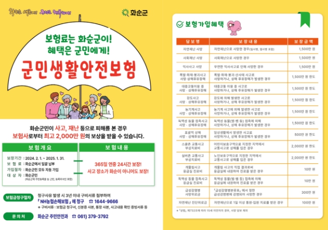 군민 생활안전 보험은 화순군에 주민등록이 된 군민(등록외국인 포함)은 누구나 혜택을 받을 수 있으며, 사고 발생 지역이 어디든 관계없이 타 보험에 가입하고 있어도 중복보장이 가능하다.