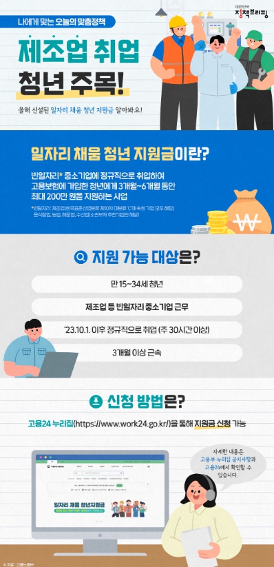 빈일자리* 중소기업에 정규직으로 취업하여 고용보험에 가입한 청년에게 3개월·6개월 차에 각 100만원씩 총 200만원을 직접 계좌로 지급해주는 사업입니다.