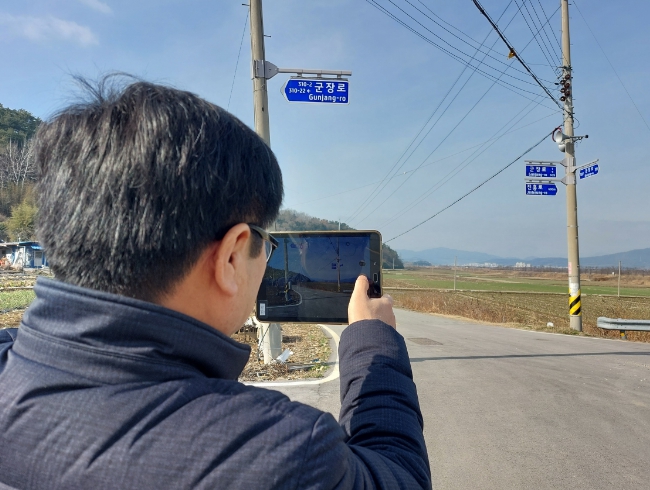 ![]() 강진군 업무담당자가 현장 업무처리 시스템인 스마트KAIS를 활용해 도로명판을 조사하고 있다. |