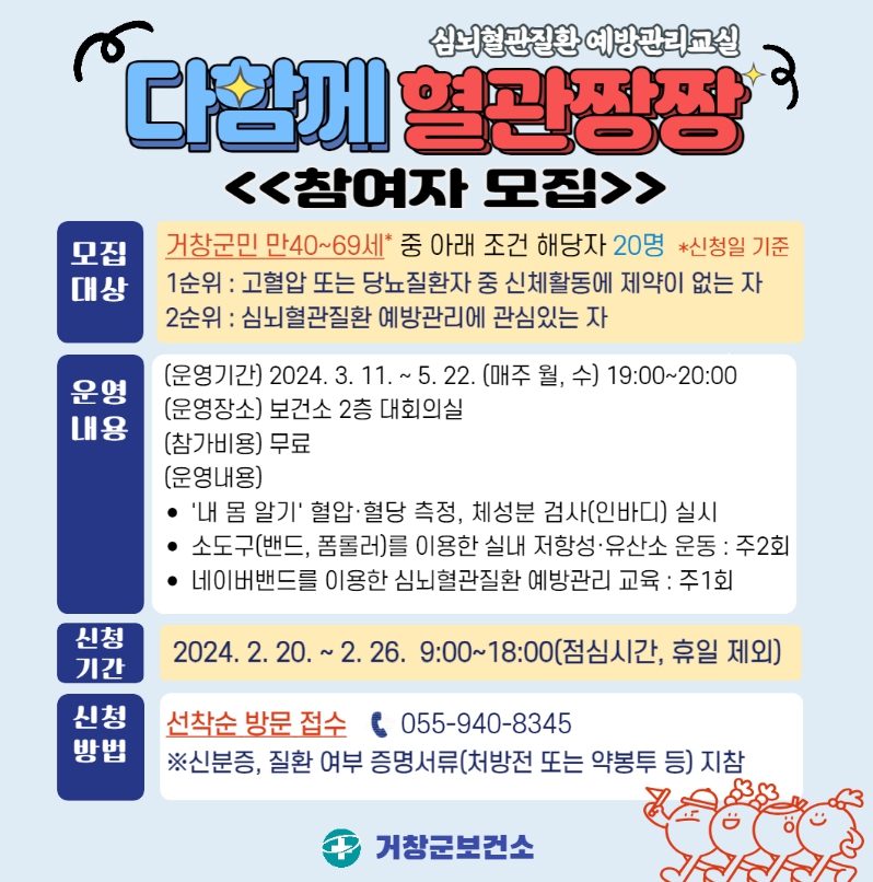 ![]() 거창군, 심뇌혈관질환 예방관리교실 참여자 모집 |