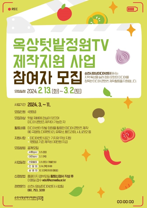 텃밭 재배에 관심 있고 미디어 콘텐츠 제작이 가능한 순천시민이라면 누구나 신청 가능하며, 서류·대면 심사를 통해 총 4명(팀)을 지원한다.