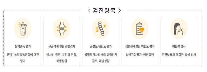 여성농업인 특수건강검진은 여성농업인에게 농작업으로 인해 자주 발생하는 질병을 예방하기 위한 검진으로 근골격계, 심혈관계, 골절·손상위험도, 폐기능, 농약중독 총 5개 영역 10개 항목에 대해 2년 주기로 검진한다. 더불어, 농작업성 질환의 조기 진단과 사후관리·예방 교육 그리고 전문의 상담도 제공하며, 검진비용의 90%를 지원한다.