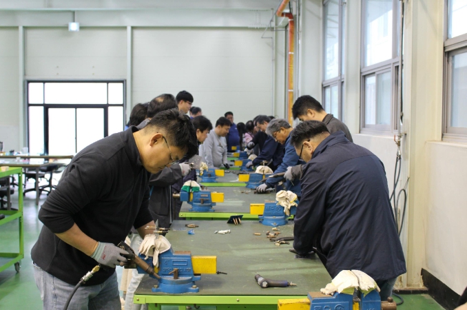 ![]() ‘항공기 기체 제작’ 신중년 교육생들이 항공기 기체 조립(리벳) 실습을 하고 있다. |