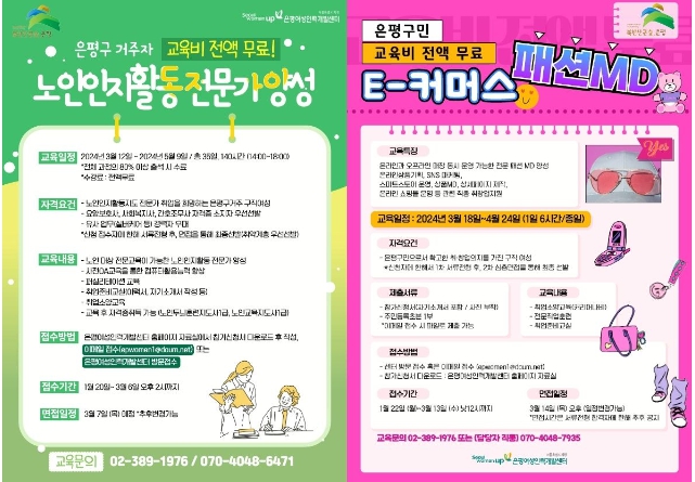 ![]() 은평구민 교육비 전액 무료인 ‘노인인지활동 전문가 양성과정’과 ‘e-커머스 패션 MD 양성과정’ 포스터 |