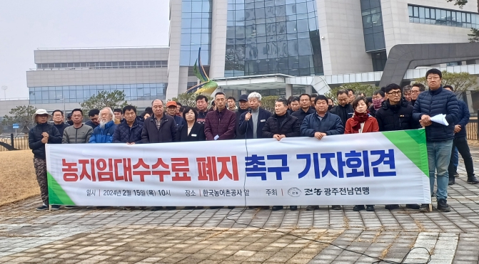 ![]() 박형대 도의원은 지난 15일 한국농어촌공사 앞에서 농지임대수탁수수료 폐지를 촉구하는 기자회견을 가졌다. |