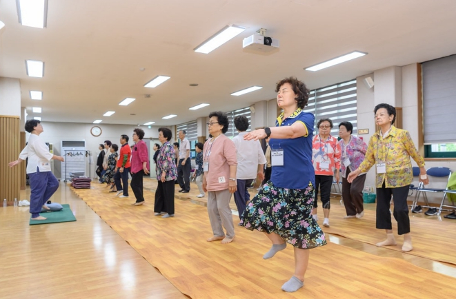 ![]() 함께 움직임 서포터즈 강사와 함께 신체활동 중인 지역 어르신들 |