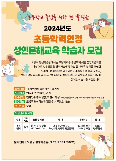 ![]() 도봉구, 초등학력인정 성인문해교육 학습자 모집 홍보 포스터 |