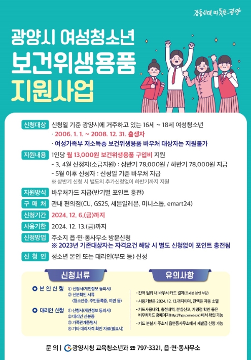 ![]() 광양시, 여성청소년 보건위생용품 구입비 지원 |
