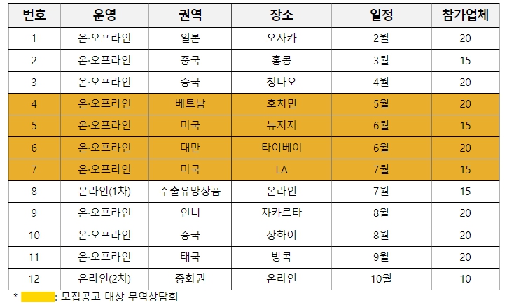 무역상담회 참가 지원사업은 해외 무역지원센터(7개국, 10개소)와 연계하여 현지 바이어와 수산식품 수출기업 간 1:1 수출 상담을 추진하는 사업으로, 2016년부터 추진됐다. 사업대상자로 선정되면 업체별로 숙박비, 통역 서비스를 전액 지원받게 된다. 이번에 참가기업을 모집하는 무역상담회는 베트남 호치민, 미국 LA와 뉴저지, 대만 타이베이에서 개최되는 무역상담회이며, 하반기 모집은 6월에 추진할 예정이다.