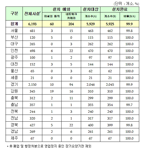 미설치 시설은 4개소(0.1%)로 폐원 절차 진행 중인 2개소를 제외하고 시정명령(1개소), 과태료 처분(1개소) 시설은 2월 중 설치 완료할 예정이다.