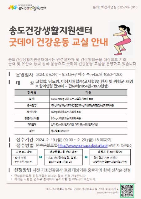 ![]() 송도건강생활지원센터, ‘굿데이 건강운동 교실’ 참여자 모집 |